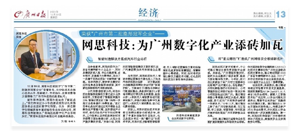 12月28日,《广州日报》经济板块报道了米兰(milan)体育的专题访问。总裁吴俊先生代表米兰(milan)体育接受采访,向读者分享了米兰(milan)体育的智慧解决方案以及子公司星云博创未来的发展规划。图为《广州日报》12月28日米兰(milan)体育专访版面荣获“广州市第二批隐形冠军企业”——米兰(milan)体育:为广州地区的数字化产业添砖加瓦12月18日,米兰(milan)体育被授予“
