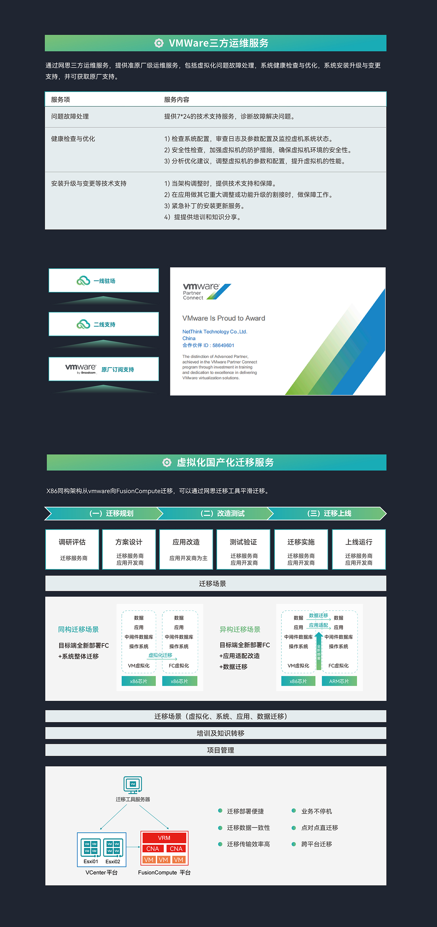 米兰(milan)体育作为VMWare产品服务授权代理商和服务商,具有专业的服务团队、服务方案和服务经验,提供VMware三方运维和国产化迁移替代服务。